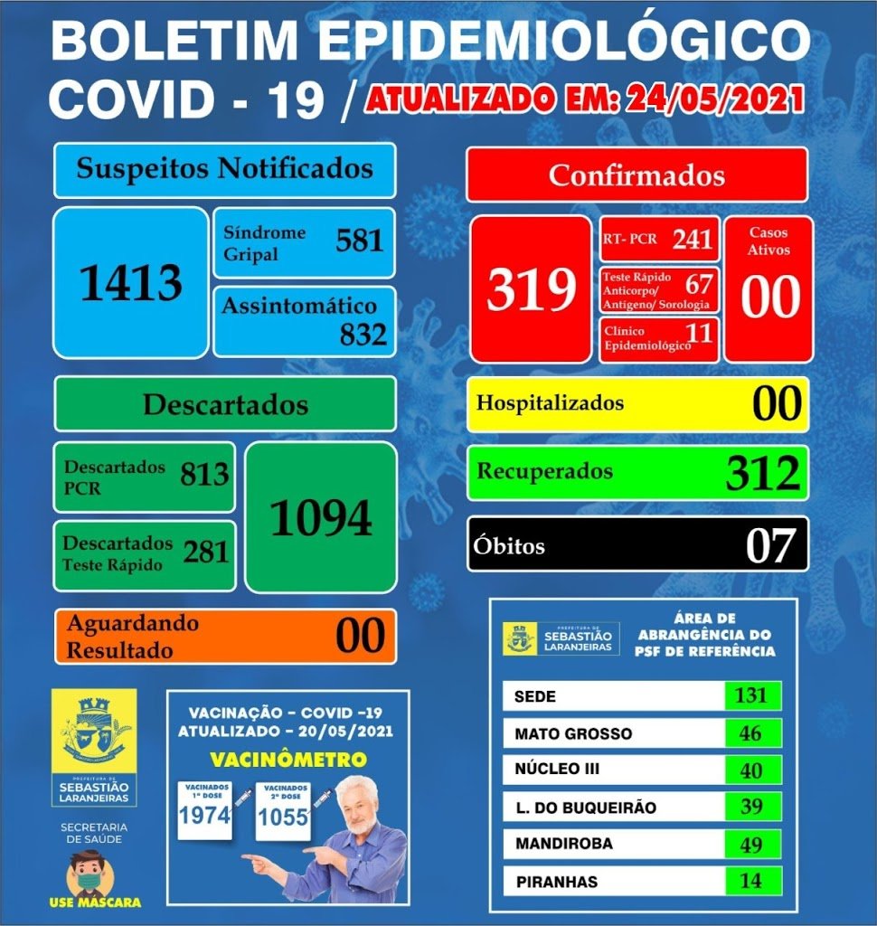 NESTA NOITE DE SEGUNDA-FEIRA (24/05) A SECRETARIA DE SAÚDE DE SEBASTIÃO LARANJEIRAS. EMITIU O NOVO BOLETIM EPIDEMIOLÓGICO COM OS SEGUINTES DADOS: