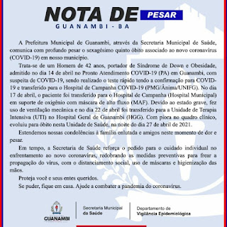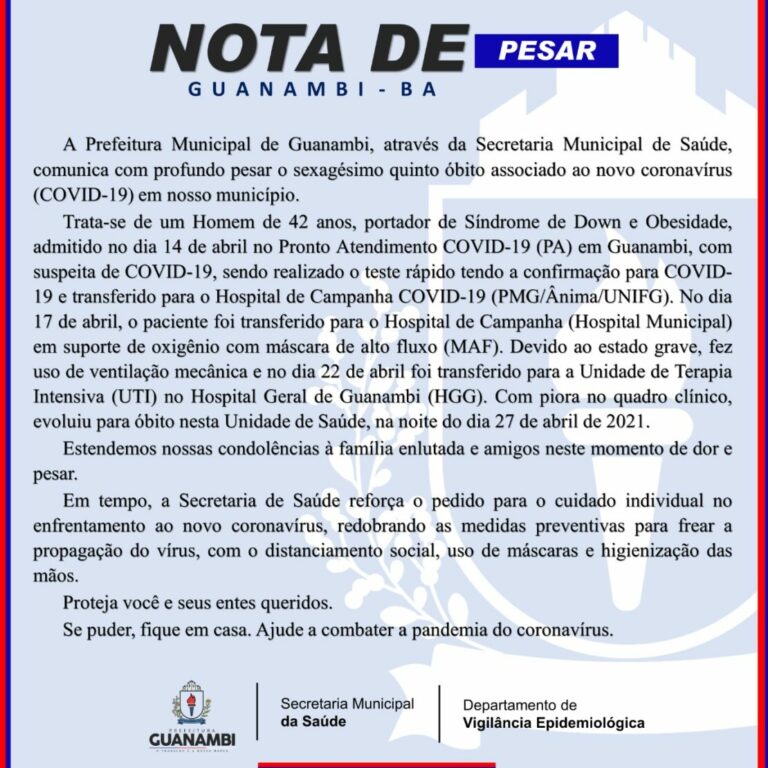 A Secretaria Municipal de Saúde de Guanambi confirmou, nesta quarta-feira (28), mais uma morte por complicações da Covid-19. O sexagésimo quinto óbito foi um homem de 42 anos.