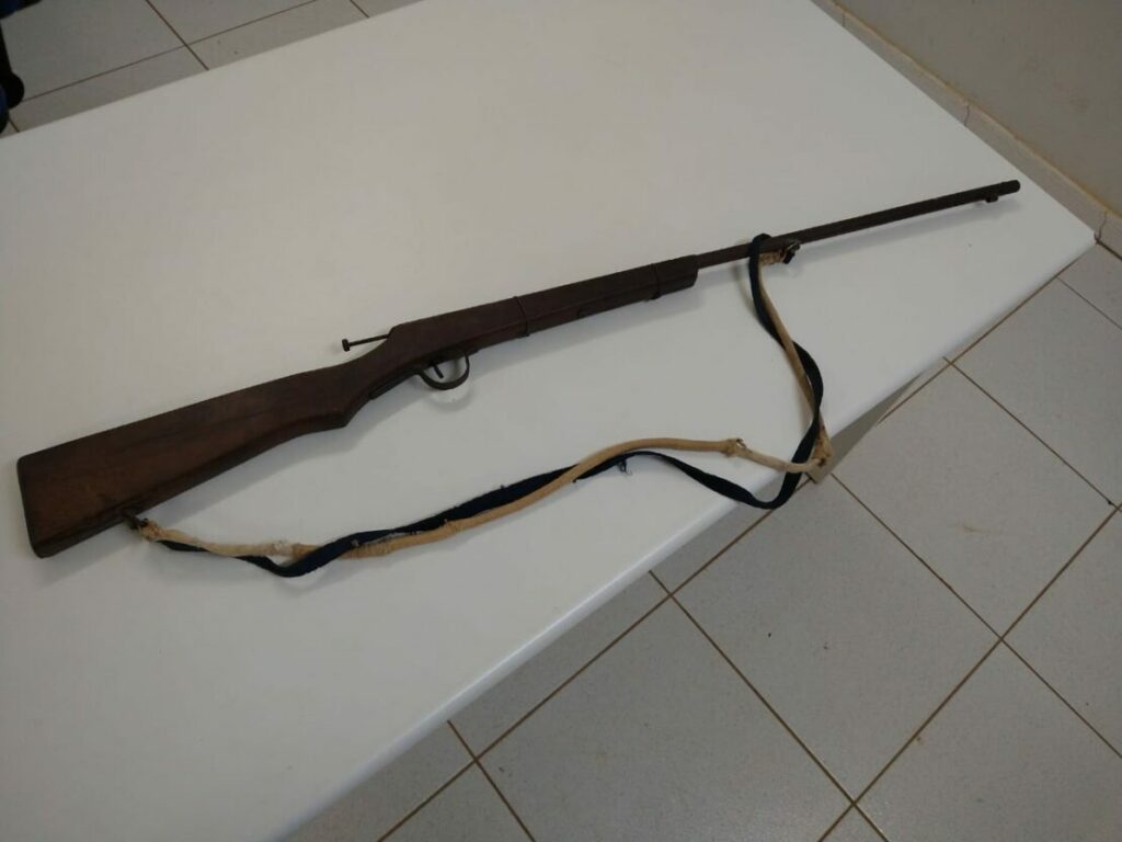 Os policiais informaram que chegaram até o suspeito após denúncias de disparo de arma de fogo no bairro, momento em que uma guarnição PM abordou um suspeito e encontrou uma arma de fogo tipo espingarda de fabricação artesanal sob sua posse.