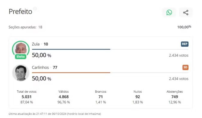 Como cidades com menos de 200 mil habitantes não têm segundo turno, seria necessário usar outro critério de desempate na hora de escolher o prefeito. E Zula (Republicanos) foi eleito por ser o mais velho.