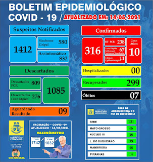 O número de recuperados é de 299 e 10 ativos. Até o momento a cidade registra 7 óbitos em virtude da doença. Ainda de acordo informações constantes no boletim epidemiológico, até então já foram notificados 1412 casos suspeitos da doença, 1085 foram descartados, 09 aguardam resultado e 00 hospitalizado.