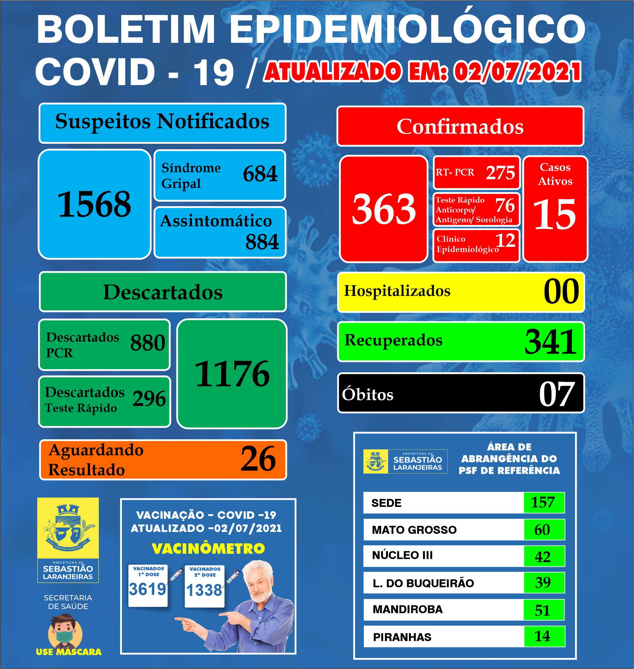 E conforme indica o boletim epidemiológico, o número total é 363 infecções da doença. Ainda informa que já foram notificados 1568 casos suspeitos da doença onde 1176 foram descartados e 26 pessoas pessoas aguardam resultados.