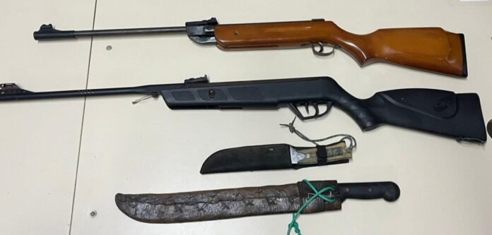 Durante a inspeção no local, a guarnição localizou dois rifles adaptados para o calibre .22, além de um facão e uma faca. Também foram identificadas duas motocicletas com irregularidades na documentação, que acabaram removidas.