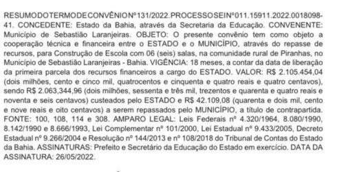 A Prefeitura Municipal de Sebastião Laranjeiras, firmou convênio nesta quinta-feira, dia 26, viabilizando recursos na ordem de R$ 2 milhões, para construção de uma moderna unidade de ensino na localidade de Piranhas.