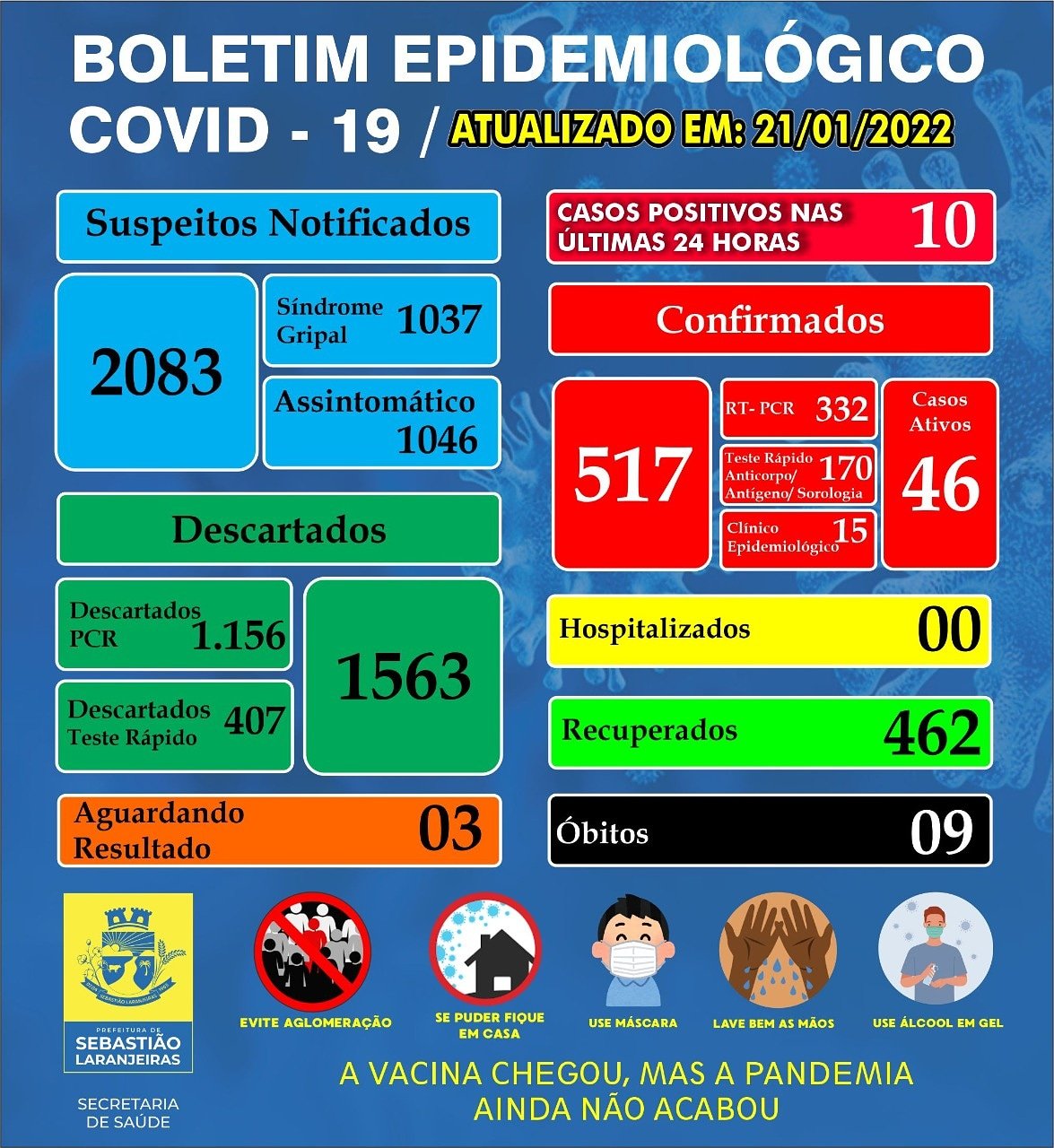 Nesta sexta-feira (21/01) a secretaria municipal de saúde de Sebastião Laranjeiras, emitiu mais um boletim epidemiológico de covid-19, onde 10 novos casos de covid-19 foram confirmados nas últimas 24 horas.