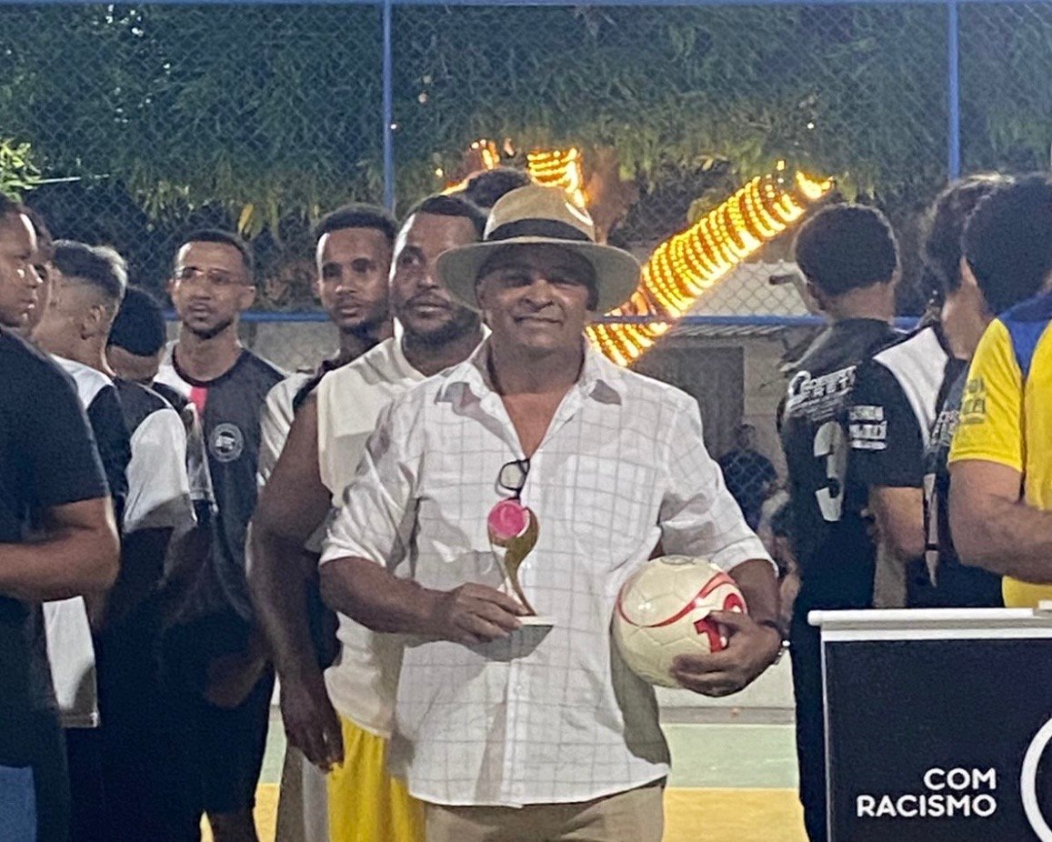 Ao lado dos atletas, Tozinho segura a bola e o troféu do campeonato, reforçando seu apoio ao esporte local e à integração da comunidade. Em sua fala, o ex-vereador destaca o papel social do torneio: