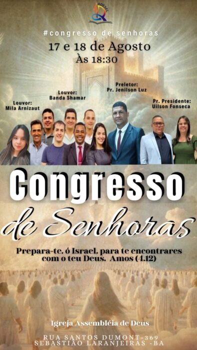 A Igreja Assembleia de Deus em Sebastião Laranjeiras Bahia, sob a liderança do Pastor Uilson Fonseca, promove neste sábado e domingo (17/08 e 18/08) às 18:30hs o congresso de senhoras.