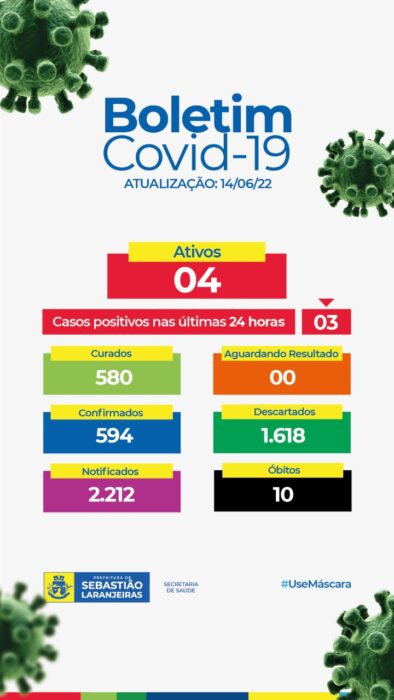Nesta terça-feira (14/06) foi divulgado mais um boletim epidemiológico Covid-19 pela secretaria municipal de saúde de Sebastião Laranjeiras , onde 03 casos positivos de covid-19, foram confirmados nas ultimas 24 horas.